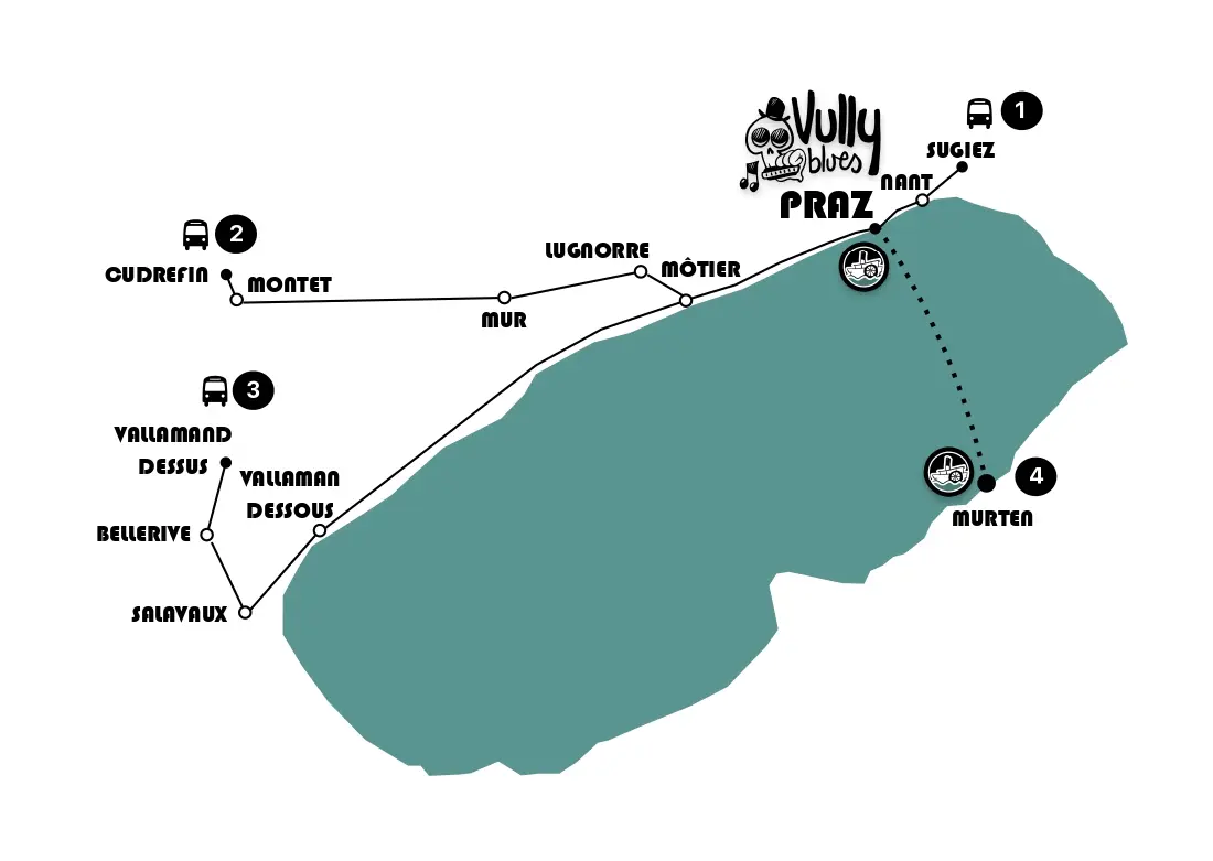 - Oder fahrt bis Sugiez, wo euch unser Blues Bus direkt zum Festivalgelände bringt.